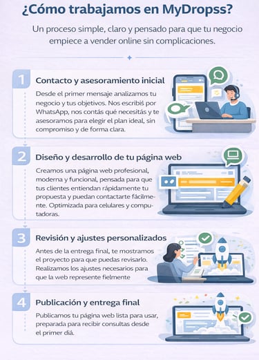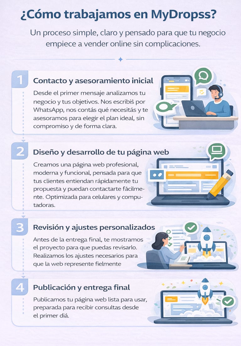 En MyDropss trabajamos con un proceso simple y transparente para que puedas tener tu presencia online sin estrés ni complicaciones. Desde el primer contacto te asesoramos de forma clara, entendemos tu negocio y definimos juntos la mejor solución para vos.